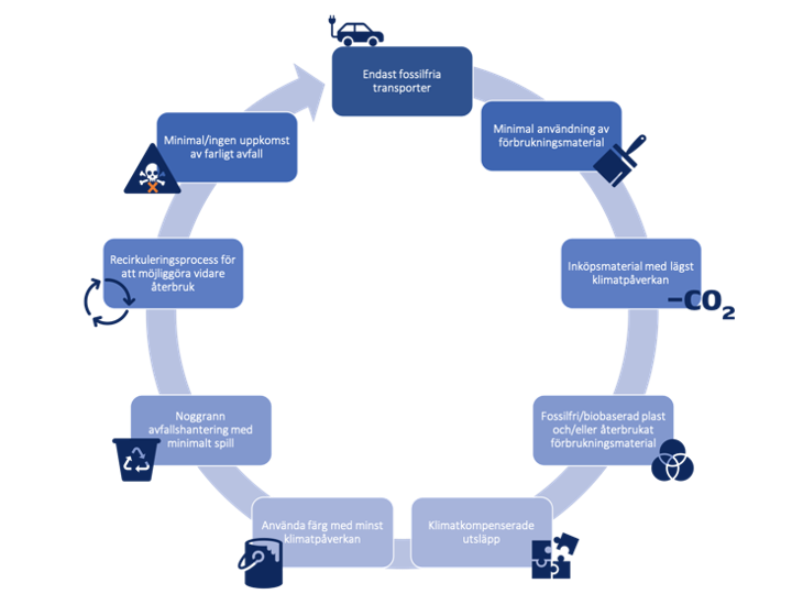Andra åtgärder som har gett resultat är att byta till förnyelsebar fjärrvärme, göra medvetna inköp av förbrukningsmaterial och implementera åtgärder för att förebygga spill.